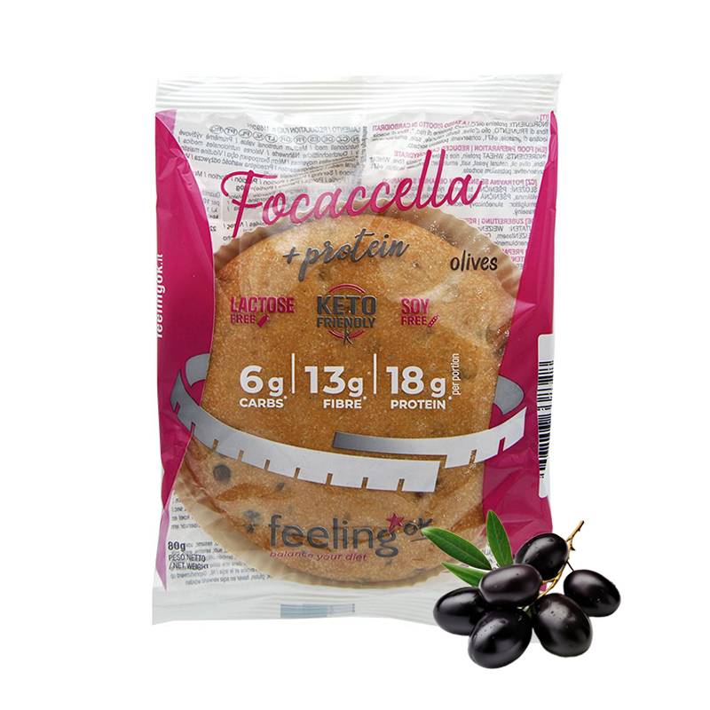 La Focaccella + Protein de Feeling OK est une focaccia sans farine, moelleuse et légère, pensée pour ceux qui recherchent un pain savoureux, riche en protéines et faible en glucides. Avec 18 g de protéines, 6 g de glucides et 13 g de fibres par portion, elle constitue un snack ou un repas pratique pour les régimes keto, low carb ou végan, tout en apportant une saveur méditerranéenne intense grâce aux olives sélectionnées.
